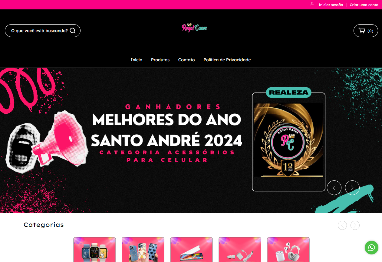 Landing PageRoyal Cases é uma empresa especializada na produção de capas e acessórios elegantes para celulares, visando atender pessoas que desejam se destacar. Seu portfólio inclui capas para iPhone e Samsung, além de diversos acessórios como carregadores, protetores de tela e suportes para carros.